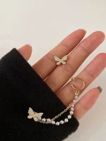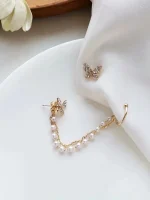 Gold Plated Butterfly Earrings with Pearl Chain Cuff | Korean Style | Zirconia Drops