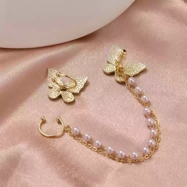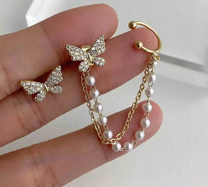Gold Plated Butterfly Earrings with Pearl Chain Cuff | Korean Style | Zirconia Drops