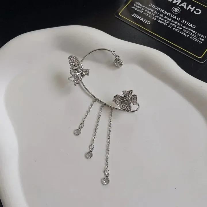Korean Butterfly Tassel Ear Cuff – No Piercing, Gold & Silver, Sparkling Zircon Crystal Clip Earrings for Women