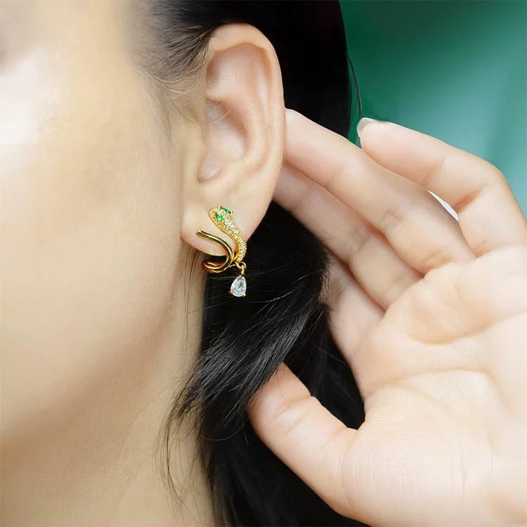 Fairylite Serpent Luxe Earrings – Gold Snake Earrings with Green Gem Eyes & CZ Drop