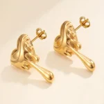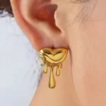These elegant gold-toned earrings feature a unique melting heart design, perfect for adding a touch of charm to your look. Made with stainless steel and 18K gold plating, these stud earrings are secured with a post and back closure for a comfortable fit. Whether it’s a casual outing or a special occasion, these earrings are sure to stand out.
