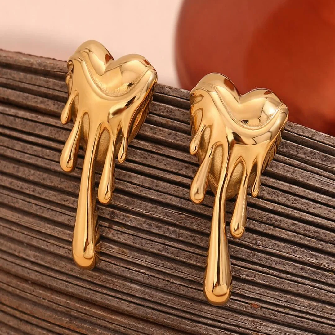 These elegant gold-toned earrings feature a unique melting heart design, perfect for adding a touch of charm to your look. Made with stainless steel and 18K gold plating, these stud earrings are secured with a post and back closure for a comfortable fit. Whether it’s a casual outing or a special occasion, these earrings are sure to stand out.